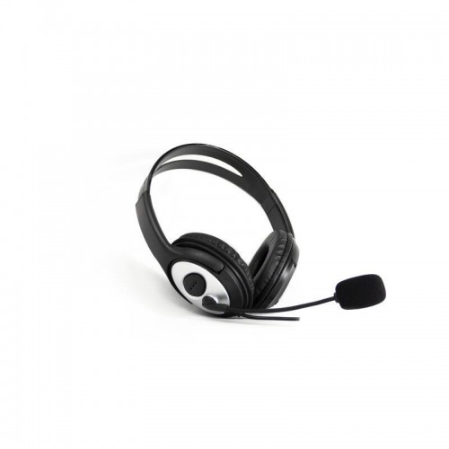 Auscultadores Coolbox Coolchat 3.5 com microfone integrado, controlo de volume no cabo e conectores jack 3.5mm. Design supra-auricular, em preto e prata. Ideal para chamadas e música.