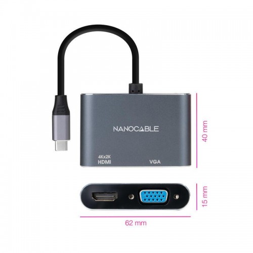 O conversor Nanocable USB-C para HDMI e VGA permite ligar o seu dispositivo USB-C a um monitor ou projetor com entrada HDMI ou VGA. Compatível com vários dispositivos, incluindo MacBook Pro e Chromebooks. Design compacto e construção em alumínio para durabilidade.