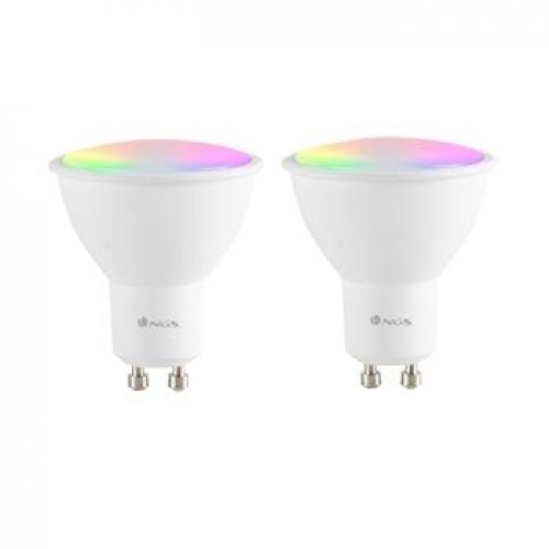 Pack de 2 lâmpadas LED inteligentes NGS Gleam 510C GU10 de 5W, controladas remotamente via app NGS, compatíveis com Alexa e Google Assistant. Oferecem uma redução de consumo de energia até 80%, luminosidade de 460 lm e temperatura de cor ajustável (2100K-6500K).