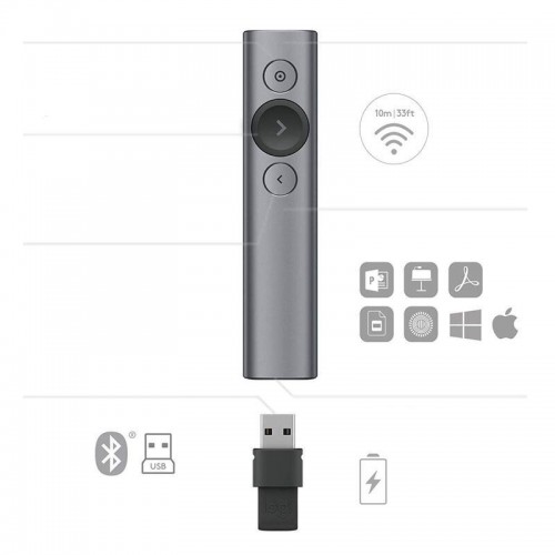 Apresentador sem fios Logitech Wireless Presenter com ponteiro laser, ideal para apresentações profissionais. Design elegante e compacto, com 3 botões intuitivos para controlo total da sua apresentação. Compatível com Windows, macOS e diversos softwares de apresentação.