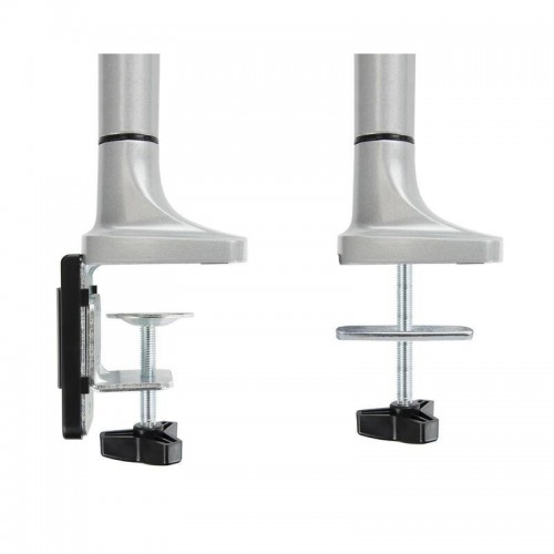 A instalação é facilitada pela compatibilidade com interfaces de montagem VESA de 75x75mm e 100x100mm. O suporte pode ser fixado à mesa utilizando uma abrazadera ou através de um sistema de atornillamento, permitindo uma instalação segura e estável. O design elegante e moderno, em alumínio prateado, complementa qualquer tipo de ambiente de trabalho. Além da funcionalidade, o suporte demonstra-se durável e construído com materiais de alta qualidade, assegurando uma longa vida útil.
