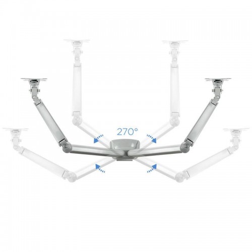 Com braços articulados, pode ajustar a altura de cada monitor individualmente, encontrando a posição ideal para reduzir a tensão no pescoço e costas. A rotação de 360° e a inclinação de -90° a +90° permitem a personalização total da posição dos ecrãs, facilitando a adaptação a diferentes tarefas e ângulos de visão. O sistema de pistão a gás integrado assegura um movimento suave e sem esforço, permitindo ajustes precisos e rápidos da posição do monitor. A capacidade máxima de peso por monitor é de 18kg, garantindo a compatibilidade com uma grande variedade de modelos e tamanhos de ecrã.