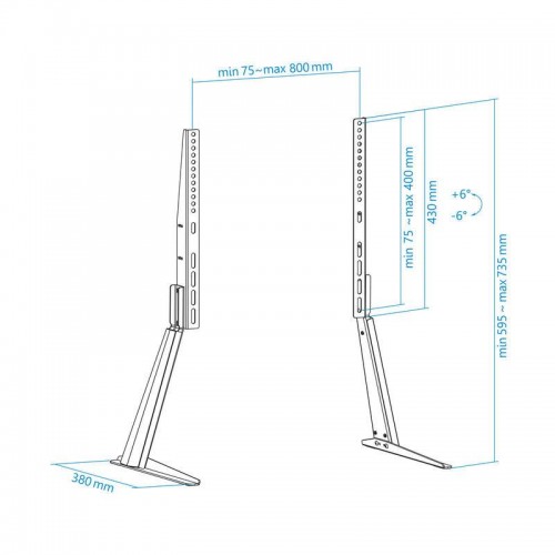 Para garantir um ajuste perfeito, o suporte permite inclinação ajustável em +6º, 0º e -6º, permitindo encontrar o ângulo ideal para visualização confortável. A altura do suporte também é ajustável, variando entre 595mm, 666mm e 735mm, proporcionando flexibilidade para diferentes configurações de mesa e posições de visualização. A base do suporte tem dimensões de 835x380 mm. O suporte ainda inclui um prático sistema de organização de cabos, mantendo os fios arrumados e organizados, e almofadas de silicone para proteger seu mobiliário. Com peso líquido de 2,86kg e bruto de 3,02kg, o suporte é fácil de montar e instalar, fornecendo uma solução completa para a sua necessidade de suporte de ecrã.
