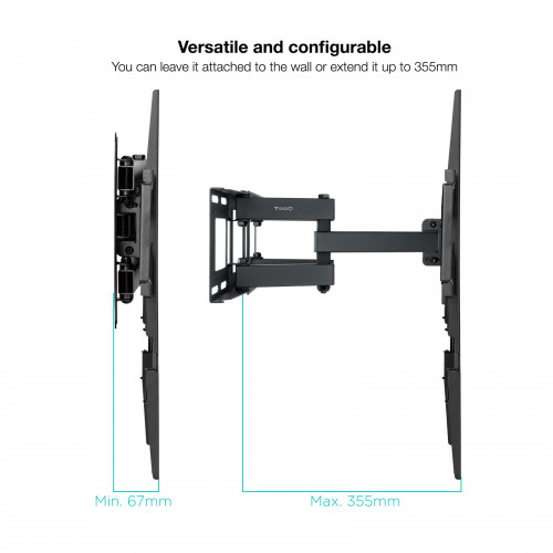 A estética também foi considerada. O suporte é construído em ferro de alta qualidade e apresenta uma elegante cor preta, integrando-se perfeitamente em qualquer decoração moderna. O seu design elegante e robusto é sinónimo de qualidade e durabilidade. O nivelador incluído garante uma instalação perfeitamente nivelada, evitando quaisquer inclinações indesejadas. A distância à parede é ajustável entre 6,7 cm e 35,5 cm.