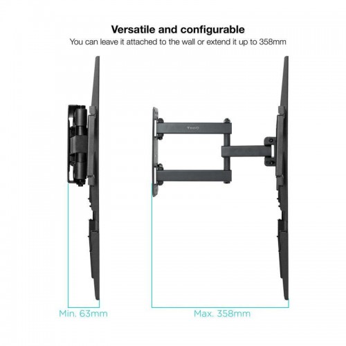 A instalação é facilitada pela inclusão de um kit de montagem completo (ferramentas não incluídas). A distância da parede é ajustável entre 63 e 358 mm, proporcionando flexibilidade na colocação do suporte. Para uma instalação perfeita, o suporte inclui um nível de bolha, que assegura um alinhamento preciso e garante a estabilidade da sua televisão.