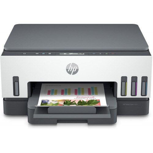 Impressora multifuncional HP Smart Tank 7005, com impressão, digitalização e cópia, Wi-Fi e digitalização para PDF. Oferece impressão a baixo custo com tinta incluída para até 12.000 páginas a preto e 8.000 a cores. Impressão de alta velocidade e fácil recarga de tinta.