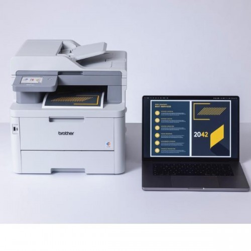 Impressora multifunções Brother MFC-L8340CDW, laser a cores, com Wi-Fi e impressão duplex automática. Velocidade de 30 ppm em preto e branco. Ciclo de funcionamento mensal de 4000 páginas. Formato A4.