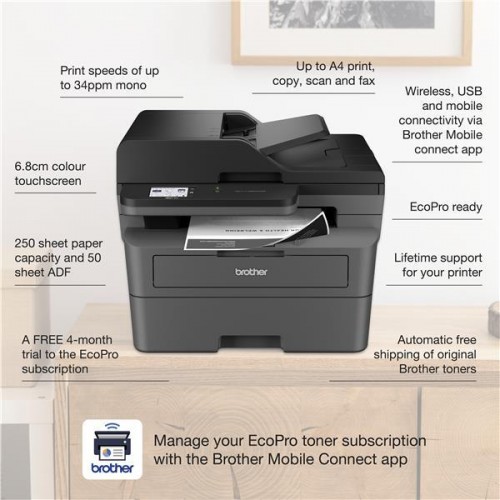 Impressora multifunções Brother MFC-L2860DWE a laser monocromática A4. Impressão, digitalização, cópia e fax rápidos. Impressão frente e verso automática, ADF, e grande capacidade de papel. Wi-Fi e rede integrada. Velocidade de impressão de 34 ppm. Ciclo de funcionamento mensal de 2500 páginas. Garantia de 36 meses. Compatível com subscrição EcoPro para toner.