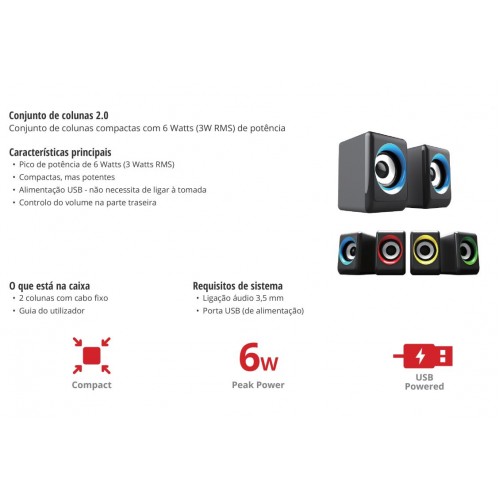 Com uma potência de 6W, estas colunas proporcionam um som claro e nítido, adequado para ouvir música, ver vídeos ou realizar videochamadas. A ligação USB simplifica a configuração, eliminando a necessidade de fontes de alimentação adicionais. O controlo de volume na parte traseira permite um ajuste rápido e fácil.