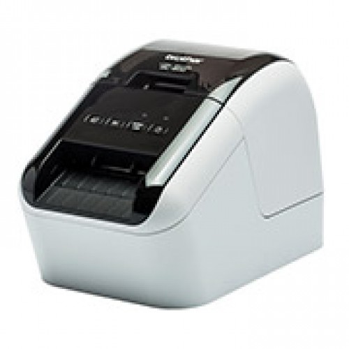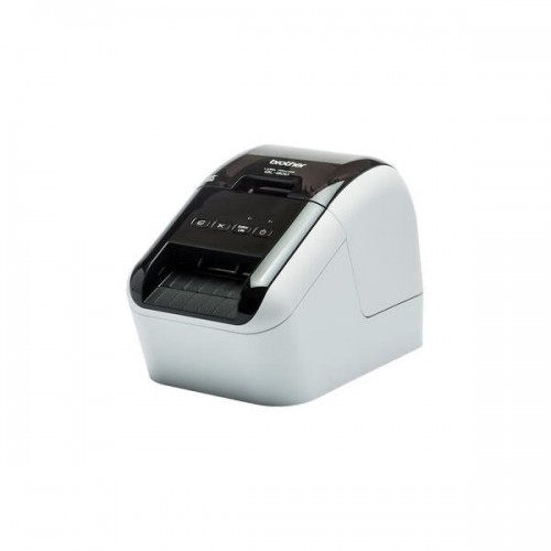 Impressora de etiquetas profissional Brother QL-800, que utiliza tecnologia térmica direta para imprimir etiquetas a preto e vermelho. Oferece alta velocidade de impressão (93 etiquetas por minuto) e suporta fitas com largura de até 62mm. Possui resolução de 300x600 ppp. Ideal para aplicações comerciais e industriais.
