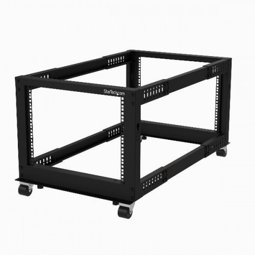 Rack de servidor Startech 4POSTRACK8U, robusto e prático para organizar equipamentos de TI.  Capacidade para 8U, construção em aço, 4 pilares ajustáveis e cor preta elegante.