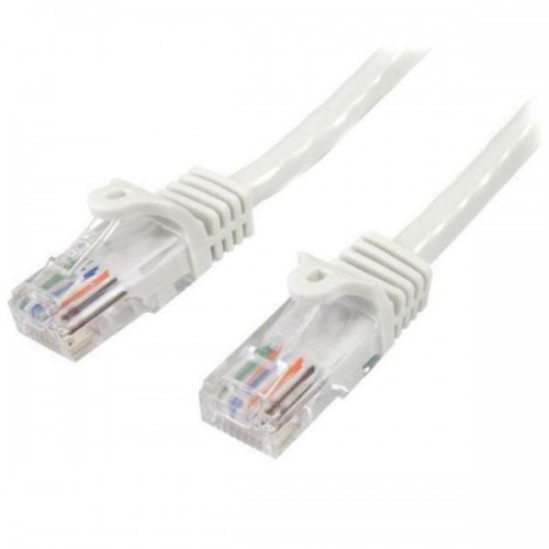Cabo de rede Cat5e UTP da Startech, modelo 45PAT10MWH, com código EAN 0065030870962. Este cabo de 10 metros, sem blindagem, possui conectores RJ-45 macho em ambas as extremidades, ideal para conexões Ethernet. É de cor branca e não é um cabo cruzado.