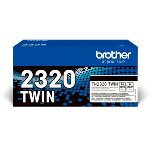 Pack com dois toners pretos Brother TN2320 de alta capacidade. Cada toner tem uma duração estimada de 2600 páginas (segundo ISO/IEC 19752). Compatível com vários modelos de impressoras Brother, incluindo HLL2300D, HLL2340DW, HLL2360DN, HLL2365DW, DCPL2500D, DCPL2520DW, DCPL2540DN, MFCL2700DW, MFCL2720DW e MFCL2740DW.