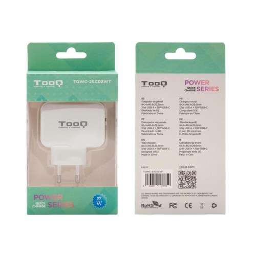 O carregador de parede Tooq é uma solução compacta e eficiente para carregar os seus dispositivos USB. Com duas portas, uma USB-A e uma USB-C, permite carregar simultaneamente dois dispositivos. A potência total de 27W garante um carregamento rápido e eficiente, ideal para smartphones, tablets, e outros dispositivos.