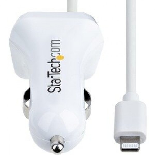 Carregador de carro StarTech.com com cabo Lightning enrolado de 1m, ideal para carregar iPhones e outros dispositivos Apple e Android. Oferece carga de alta potência (2.1A por porta) para carregar dois dispositivos simultaneamente. Design compacto e prático, cor branca. Inclui duas portas USB-A.