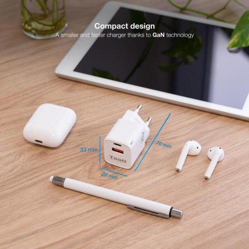 O carregador de parede Tooq GaN USB-C/PD + USB-A/QC de 30W, na cor branca, é a solução ideal para carregar rapidamente os seus dispositivos móveis. A sua tecnologia GaN (Nitreto de Gálio) permite um carregamento mais eficiente e com menos geração de calor, em comparação com os carregadores tradicionais. Este avanço tecnológico também contribui para um design mais compacto e leve, ideal para transportar no seu dia a dia.