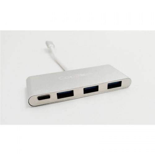 Hub USB Coolbox COO-HUC3U3PD, em alumínio, com 4 portas (1x USB-C, 1x USB-A, 2x USB-C). Oferece velocidade de transferência de dados até 5000 Mbps, ideal para conectar vários dispositivos. Design compacto e elegante.