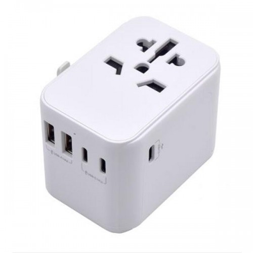 Adaptador de tomada universal Ewent EW1470, branco, compatível com mais de 224 países. Inclui 4 tomadas retráteis (Tipo B, C, D, G, I, L) para diferentes padrões internacionais e 5 portas USB (2 USB-A, 3 USB-C) para carregar vários dispositivos simultaneamente. Possui proteção contra sobrecargas e indicador LED. Ideal para viagens.
