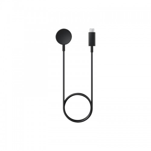 Carregador sem fios Samsung EP-OR900BBEGWW, compatível com vários modelos de relógios Galaxy Watch. Oferece carga rápida e utiliza uma conexão USB-C. Design compacto e elegante em preto.