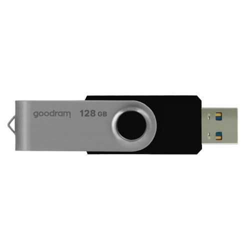 Unidade de memória USB Goodram UTS3 de 128GB, com interface USB 3.2 Gen 1 para transferência de dados rápida. Design compacto e elegante, em preto. Ideal para armazenamento e transporte de ficheiros.