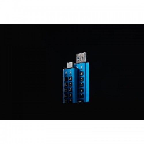 Para além das suas funcionalidades principais, o pendrive possui funções adicionais como função de "somente leitura", funções de utilizador e administrador, e compatibilidade com os padrões FIPS 140-3. O design elegante e azul contribui para um aspeto moderno e profissional, tornando-o um acessório prático e seguro para uso pessoal e profissional.