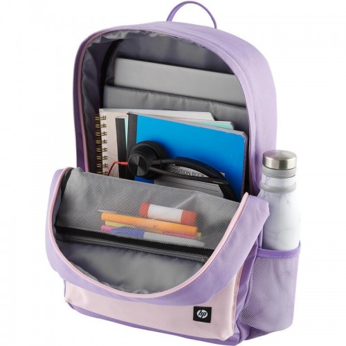 Mochila HP Campus Lavender, ideal para portáteis de 14 a 15,6 polegadas. Design moderno e elegante, fabricada com 50% de materiais reciclados. Compartimento acolchoado para portátil, múltiplos bolsos para organização e materiais impermeáveis para proteger seus pertences.