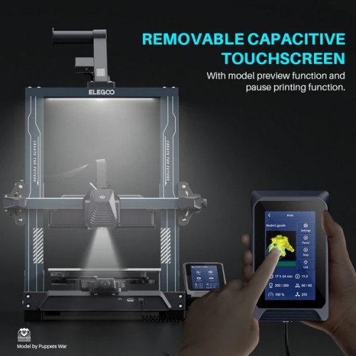 A sua principal característica é a velocidade de impressão excepcional, atingindo até 500 mm/s. No entanto, para garantir resultados ótimos, a Elegoo recomenda uma velocidade padrão de 250 mm/s. Esta capacidade de alta velocidade é conseguida graças a um processador de computação de alto desempenho com um algoritmo de controlo de movimento preciso, assegurando maior precisão e eficiência no processo de impressão. A impressora incorpora uma placa-mãe silenciosa de alta velocidade, baseada num processador ARM 64-bit 1.5G quad-core, minimizando o ruído durante a operação. Com 8 GB de memória, permite o armazenamento seguro de mais de 400 ficheiros de modelos.
