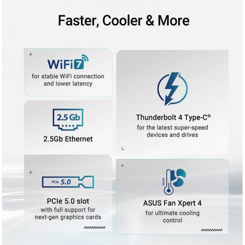 A ASUS Prime Z890-P WiFi oferece suporte para PCIe 5.0, permitindo velocidades de transferência de dados ultrarrápidas, ideal para as mais recentes placas gráficas e SSDs. Inclui também Ethernet Realtek 2.5 Gb e Wi-Fi 7 com Bluetooth v5.4, proporcionando uma conectividade de rede rápida e confiável. Possui uma porta Thunderbolt 4, porta Displayport e HDMI, USB 2.0 e USB de 10 e 5Gbps.