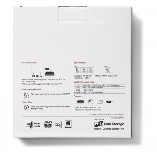 Com dimensões de 144 x 135,5 x 14 mm, a grabadora se destaca por sua portabilidade e integra-se facilmente em qualquer ambiente. Esta grabadora de DVD de 8x Super-Multi Portable Slim da LG é uma adição valiosa para qualquer pessoa que precisa de uma solução de gravação de DVD confiável, compacta e de alta velocidade.