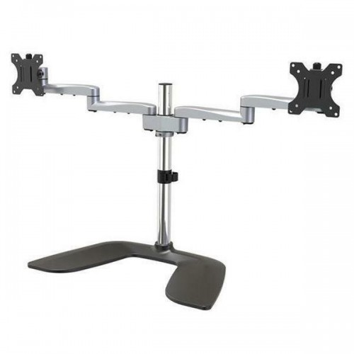 Suporte articulado para dois monitores da Startech, modelo ARMDUALSS, fabricado em metal e plástico, na cor cinzenta. Suporta até 8 kg e é adequado para monitores de até 32 polegadas. Inclui gestão de cabos. Embalagem unitária.