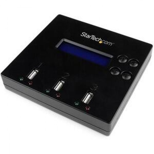 O Duplicador de Memórias Flash USB 2.0 StarTech USBDUP12 permite copiar ou apagar até duas unidades flash simultaneamente, sem necessidade de computador. Oferece duplicação 1:2, modos de duplicação (sistema de ficheiros ou unidade completa) e vários modos de apagamento (rápido, completo e seguro). Inclui ecrã LCD para monitorização e teclas de atalho. Compatível com as normas TAA e com garantia de 2 anos.