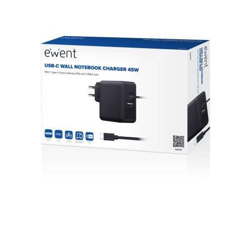 O carregador Ewent EW3979 é uma solução de carregamento versátil e eficiente para vários dispositivos eletrónicos. Com uma potência máxima de 45W, este carregador suporta uma ampla gama de equipamentos, desde portáteis a smartphones e tablets. A sua compatibilidade estende-se a dispositivos com porto USB-C, sendo também equipado com um porto USB-A adicional, permitindo o carregamento simultâneo de até dois dispositivos.