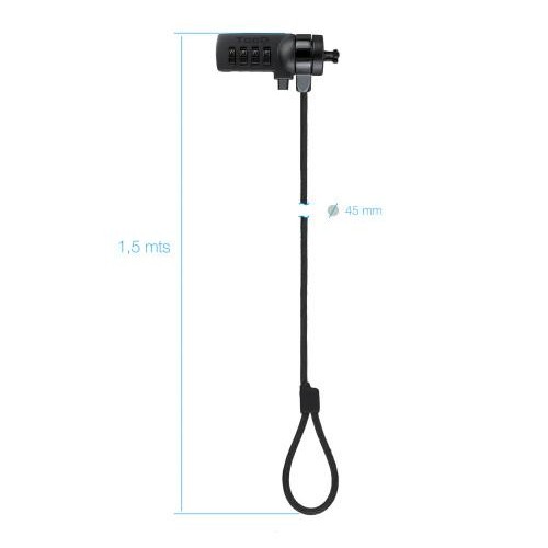 Este cabo de segurança TooQ com combinação protege o seu portátil contra roubo. Compatível com dispositivos com porto Kensington, permite definir um código de segurança pessoal. Com um comprimento de 1,5 metros, oferece flexibilidade na utilização. Construído em aço e zinco, garante resistência e durabilidade. Fácil de usar e configurar.