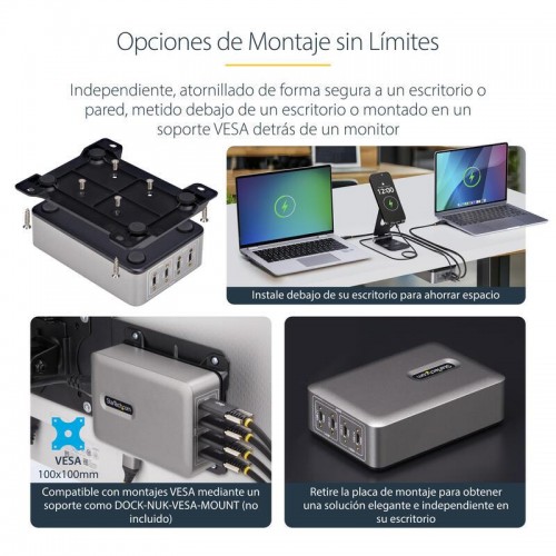 O carregador é ideal para escritórios, espaços de trabalho compartilhados ou balcões de recepção. O suporte de montagem de superfície pré-instalado (VESA 100x100) permite uma integração discreta e limpa em diferentes configurações, libertando espaço na mesa e minimizando o emaranhado de cabos. A compatibilidade com os sistemas de bloqueio Noble Wedge, K-Slot e Nano garante uma solução segura para ambientes profissionais.