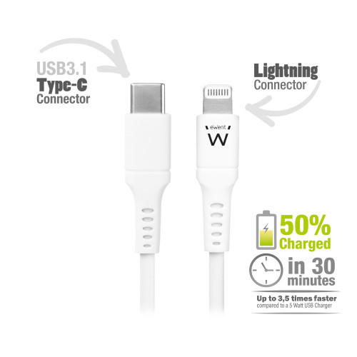 Cabo Ewent EW9915: Lightning para USB-C, 1m, Branco, Certificado Apple MFI