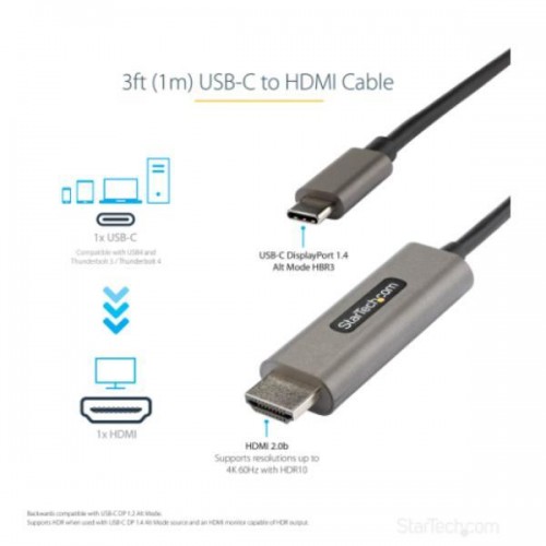 StarTech.com 3ft (1m) USB C to HDMI Cable 4K 60Hz with HDR10, Ultra HD USB Type-C to 4K HDMI 2.0b Video Adapter Cable, USB-C to HDMI HDR Monitor/Display Converter, DP 1.4 Alt Mode HBR3 - Thunderbolt 3 Compatible (CDP2HDMM1MH) - Cabo adaptador - 24 pin USB