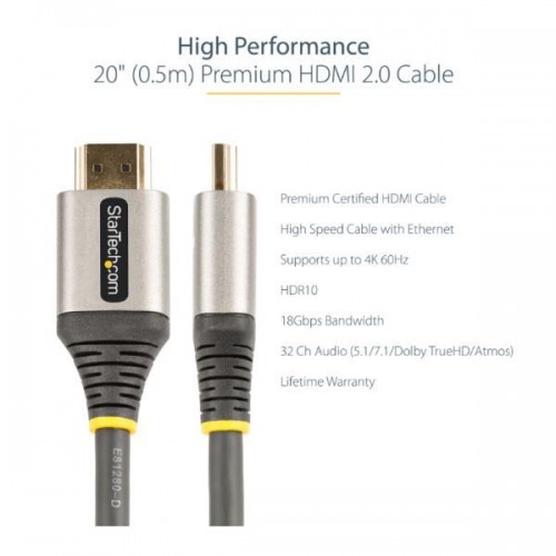 StarTech.com 20in (0.5m) Premium Certified HDMI 2.0 Cable with Ethernet, High-Speed Ultra HD 4K 60Hz HDMI Cable HDR10, ARC, HDMI Cord For Ultra HD Monitors, TVs, Displays, w/ TPE Jacket - Durable HDMI Video Cable (HDMMV50CM) - Alta Velocidade Premium - ca