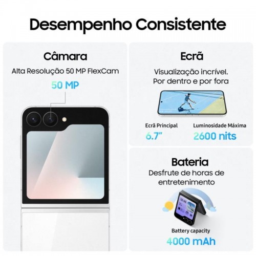 O Samsung Galaxy Z Flip7 FE 5G é mais do que um smartphone; é um reflexo do seu estilo de vida moderno e dinâmico. Com a sua combinação de design elegante, desempenho poderoso e recursos inovadores, este dispositivo foi criado para elevar sua experiência móvel a um nível totalmente novo. A segurança dos dados pessoais é uma prioridade, sendo esses dados tratados de forma segura e cifrados no dispositivo com Knox Vault.