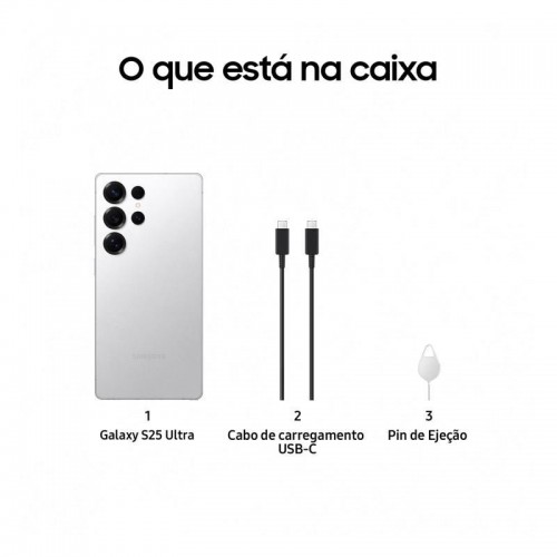 Samsung Galaxy S25 Ultra . Tamanho do ecrã na diagonal: 17,5 cm (6.9"), Resolução: 3120 x 1440 pixels. Família de processador: Qualcomm Snapdragon, Modelo de processador: 8 Elite. Capacidade RAM: 12 GB, Capacidade de armazenamento interno: 512 GB. Resolução da câmara traseira (numérico): 200 MP, Tipo de câmara traseira: Quatro câmeras. Capacidade cartão SIM: Dual SIM. Sistema operativo instalado: Android 15. Capacidade da bateria: 5000 mAh. Cor do produto: Preto, Prateado, Branco. Peso: 218 g ;