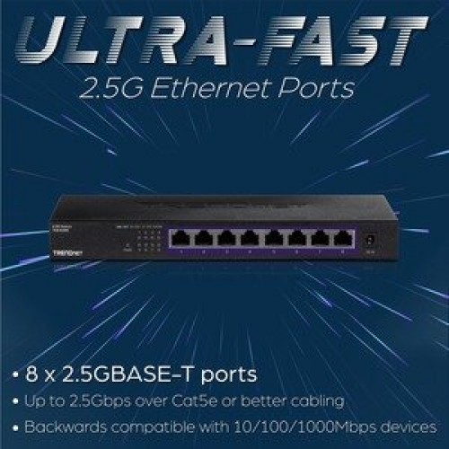 O switch não-gerenciável Trendnet TEG-S380 oferece 8 portas 2.5GBase-T para velocidades de rede melhoradas. Compatível com Layer 2. Fácil instalação e utilização. Design de montagem na parede. Consumo de energia baixo (12.40W).