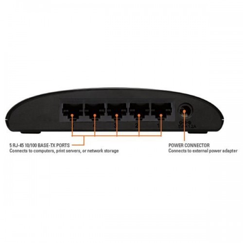 Switch de rede D-Link DES-1005D com 5 portas 10/100Mbps, com suporte a full-duplex e half-duplex. Funcionalidades incluem AUTO MDI/MDIX, controlo de fluxo, correcção automática de inversão de polaridade RX, LEDs de diagnóstico e design compacto. Detalhes completos disponíveis no site do fabricante (ver URLfab). Garantia de 24 meses.