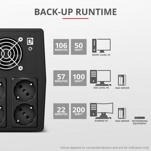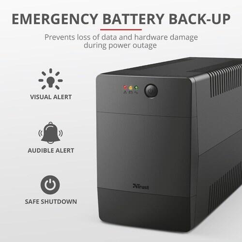 O UPS Trust Paxxon 1500VA garante a segurança dos seus equipamentos eletrônicos, fornecendo energia de reserva durante quedas de energia e protegendo-os contra sobretensões. Com uma potência de 1500VA/900W, é ideal para proteger computadores, televisores, consolas de jogos, sistemas de alarme e outros dispositivos conectados às suas quatro tomadas Schuko. O sistema AVR (regulador automático de tensão) garante estabilidade de energia, mesmo com flutuações na rede elétrica. A bateria de chumbo-ácido (12V, 9000mAh, 2 baterias, 24V DC) oferece um tempo de funcionamento de até 1,33 minutos com carga completa e 7 minutos com carga parcial. O tempo de recarga completa é de 8 horas. Seu design compacto permite montagem na parede, economizando espaço. Fácil de usar e instalar, o Paxxon 1500VA proporciona tranquilidade e proteção aos seus valiosos dispositivos. Para mais informações, consulte o site do fabricante.