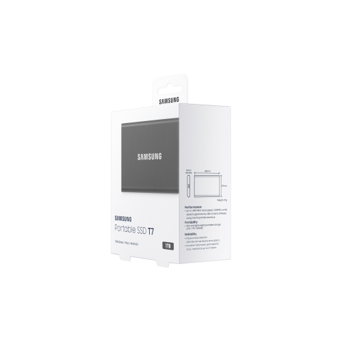 Com dimensões de 85 x 57 x 8 mm e pesando apenas 58g, o Samsung T7 é extremamente portátil. Compatível com Windows e MacOS, este disco oferece uma solução de armazenamento versátil. O seu aspeto elegante em cinzento adiciona um toque de sofisticação. A embalagem inclui o disco e a sua caixa.