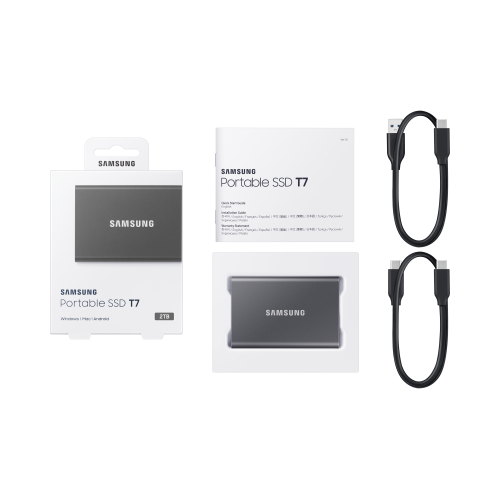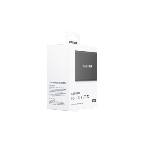 As dimensões compactas de 85 x 57 x 8 mm e o peso leve de apenas 58g tornam o Samsung T7 extremamente portátil. Compatível com sistemas operativos Windows e MacOS, este disco oferece uma solução de armazenamento universal. O seu elegante design cinzento confere-lhe um aspeto sofisticado. A embalagem inclui o próprio disco e a sua caixa.