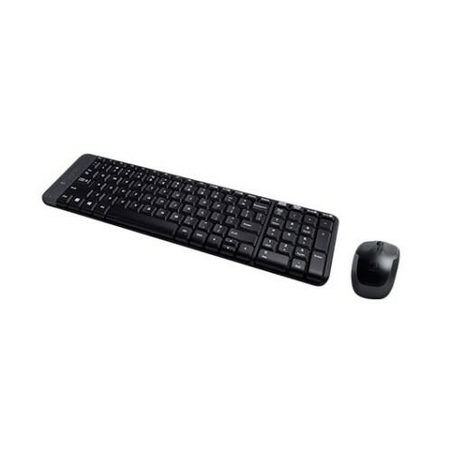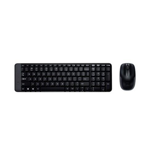 Conjunto sem fios Logitech MK220, composto por teclado e rato, na cor preta. Ideal para uso em escritório, oferece uma ligação sem fios confiável com um alcance até 10 metros. O teclado possui formato padrão e os indicadores LED mostram o estado da bateria. O rato é óptico com 3 botões e uma roda de scroll. Ambos os dispositivos funcionam com pilhas (2 pilhas AA para o teclado e 2 pilhas AAA para o rato). Ligação via receptor USB.