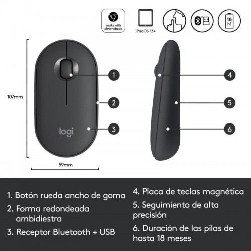 O rato sem fios Logitech Pebble M350 Grafito é uma opção elegante e silenciosa para o seu computador. Compacto e confortável, é perfeito para uso diário. Conecte-o via Bluetooth ou com o receptor Logitech Unifying.
