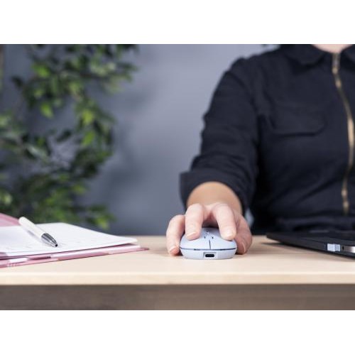 Este rato sem fios oferece duas opções de conectividade: um micro-receptor USB, que se guarda no próprio rato quando não está a ser utilizado, e Bluetooth para ligação direta a computadores portáteis ou iPads (iOS 13.4 ou superior). Os botões são silenciosos, reduzindo o ruído dos cliques em 90% em comparação com outros ratos, ideal para ambientes de trabalho partilhados. Um interruptor de DPI integrado permite ajustar facilmente a velocidade do cursor entre quatro níveis. O rato inclui ainda uma prática roda de rolagem vertical.