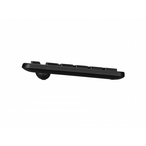 O teclado possui um design de tamanho completo (100%) com teclas Windows e teclado numérico, otimizando a produtividade. As teclas são do tipo chiclete, proporcionando uma digitação suave e silenciosa. A conectividade RF Wireless garante uma ligação estável e sem interrupções, com um alcance de até 10 metros. O design elegante em preto adapta-se facilmente a qualquer ambiente de trabalho.