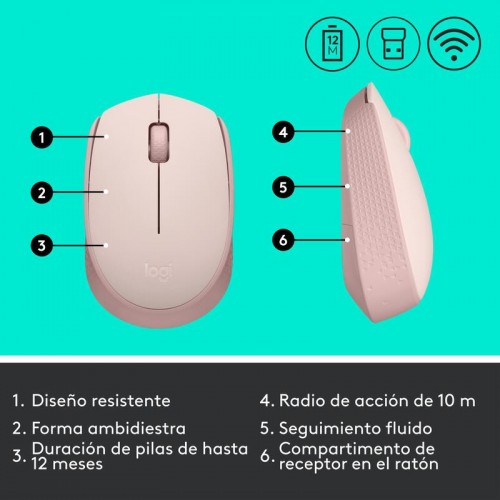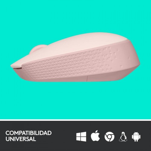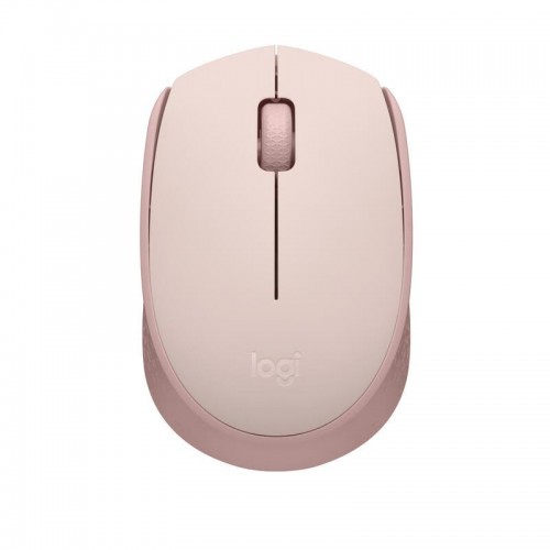 O rato sem fio Logitech M171, na cor rosa, é ambidestro e proporciona conforto e mobilidade.  Oferece tecnologia óptica para rastreio preciso e duração da bateria de até 12 meses.
