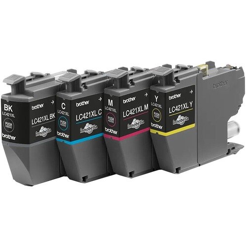 Pack de 4 tinteiros Brother LC421XLVAL de alta capacidade: 1 preto, 1 ciano, 1 magenta e 1 amarelo. Cada tinteiro tem uma duração estimada de até 500 páginas (ISO/IEC 24711). Compatível com as impressoras DCP-J1050DW e MFC-J1010DW.